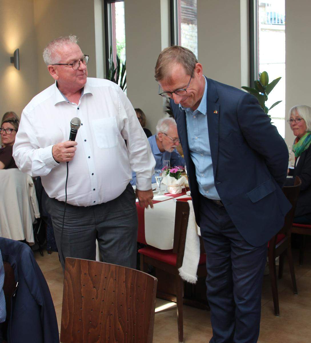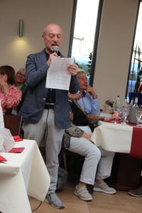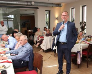 Während der Veranstaltung überraschte der neu gewählte Landrat des Landkreises Mainz-Bingen Thomas Barth die zahlreich erschienen Teilnehmer. Als er erfahren hatte, dass in seiner Gemeinde das Partnerschaftstreffen zwischen DIF Budenheim und AGIT Isola della Scala stattfindet, ließ er es sich nicht nehmen, alle Freunde persönlich zu begrüßen. Als Thomas Barth sagte, dass Stadecken-Elsheim eine Partnerschaft mit Bovolone unterhält, war das Echo groß. Liegt doch Bovolone nur einen Katzensprung von Isola della Scala entfernt. Einige italienische Gäste stammen direkt von dort. Die Ansprache von Thomas Barth kam bei allen Teilnehmern sehr gut an, hat er doch auf Deutsch und in perfektem Italienisch vermittelt, wie sehr ihm die Städtepartnerschaften im Landkreis am Herzen liegen.
