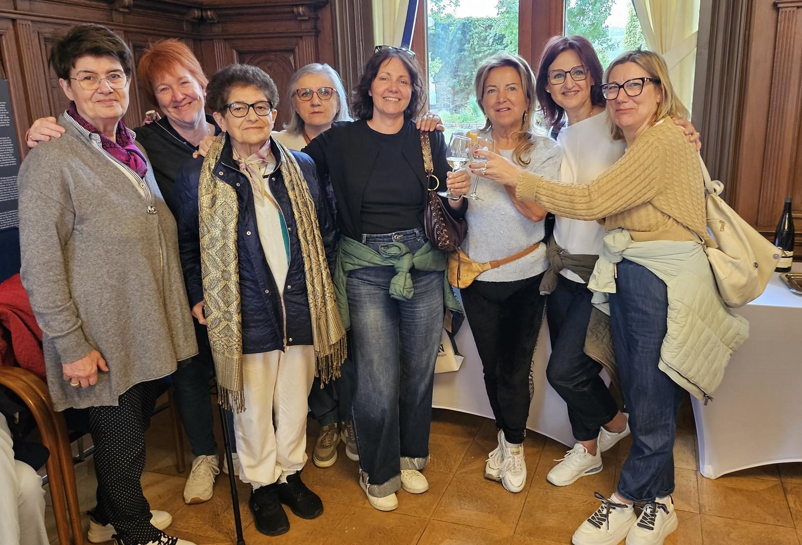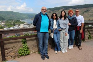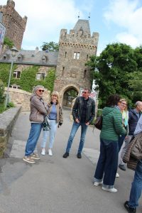 Im Innenhof der Burg Klopp gab es noch ein Gruppenfoto zur Erinnerung. Es blieb auch Zeit, um von oben die Schönheit des Eingangs zum Mittelrheintal auf sich wirken zu lassen. Das Rhein-Nahe-Eck, der Mäuseturm, die umliegenden Burgen und Weinberge sowie die Germania auf der anderen Rheinseite boten bei klarem Wetter ein wunderbares Panorama. Die Mutigen und Aktiven, die den Aufstieg auf den 37,5 Meter hohen Turm gewagt hatten, wurden mit einem noch weiter reichenden fantastischen Ausblick belohnt.