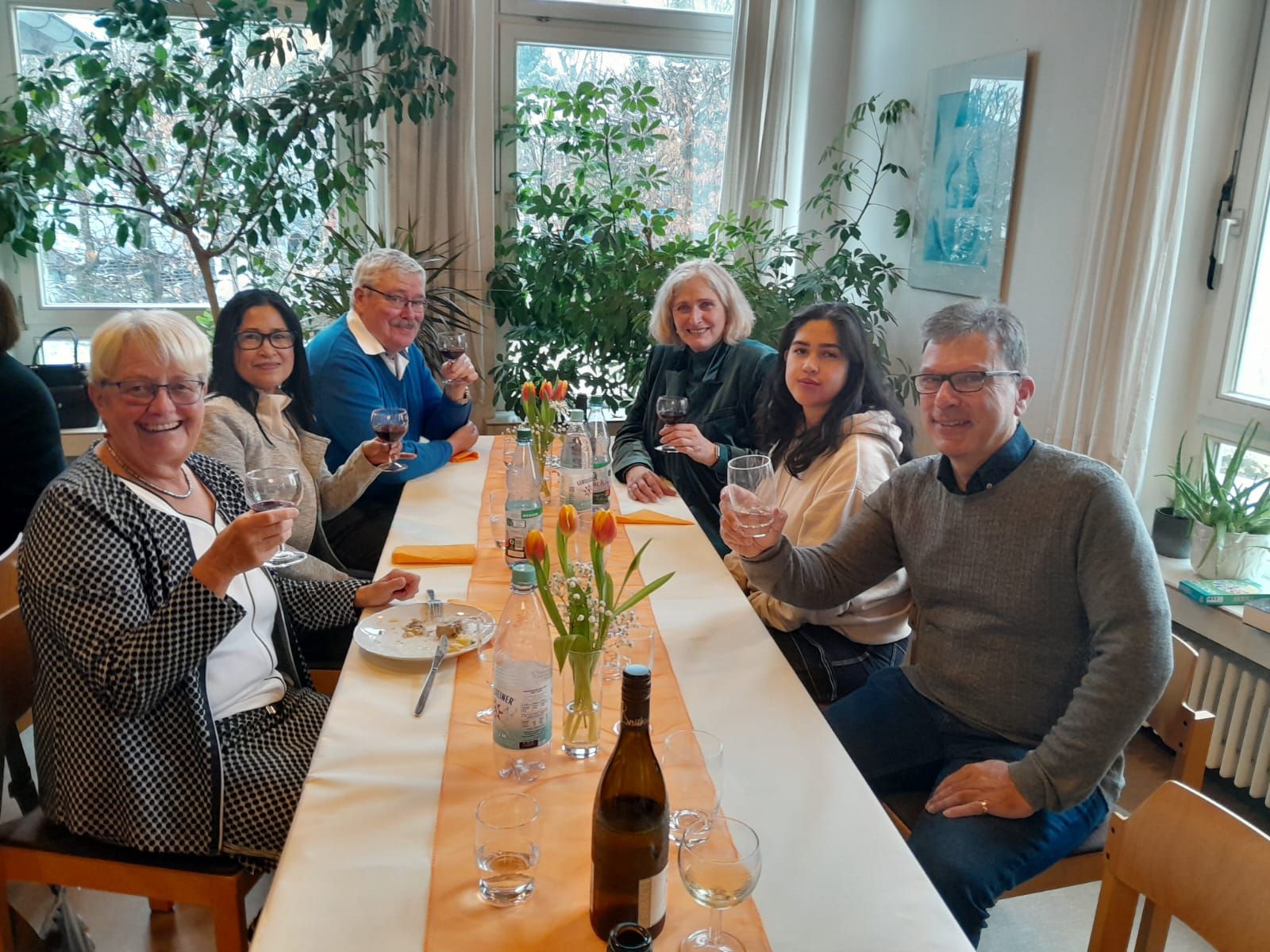 Gleich am ersten Sonntag des neuen Jahres begrüßte der Vorstand des Deutsch-Italienischen Freundeskreises Budenheim (DIF) rund 40 Mitglieder und Gäste zum Neujahrsempfang im evangelischen Gemeindehaus. An diesem Tag wirkte das nasskalte Wetter mit Schnee in der Nacht und Regen am Morgen nicht nur wenig einladend, ja es war zu befürchten, dass nicht alle kommen könnten. Zum Glück erreichten schließlich alle Teilnehmer den Saal, und darin entwickelte sich sogleich eine gute Stimmung. Die angenehme, gelöste Atmosphäre und die in warmen Farben eingedeckten und mit Tulpensträußen dekorierten Tische sorgten dafür, dass sich alle willkommen und wohl fühlten.